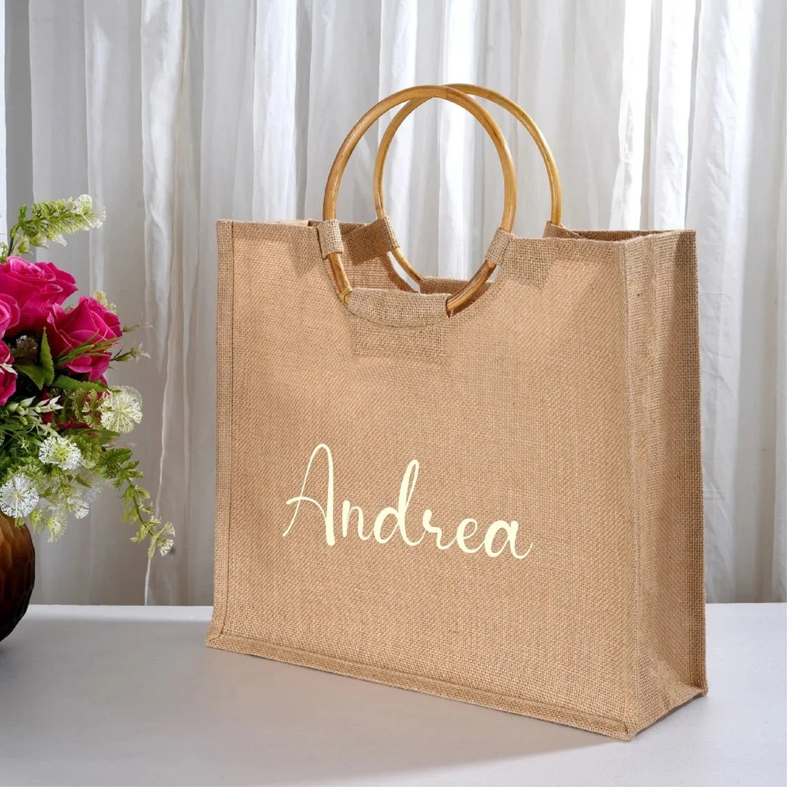 Personalized Jute Bag With Wooden Handle Burlap Tote Bag