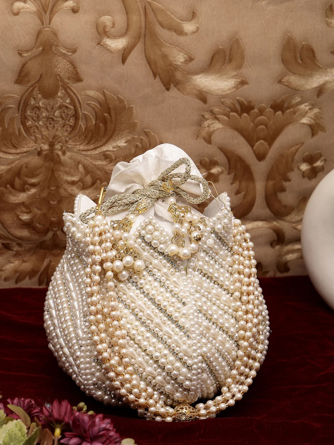 Lotus Pearl Embellished Faux Silk Potli Bag