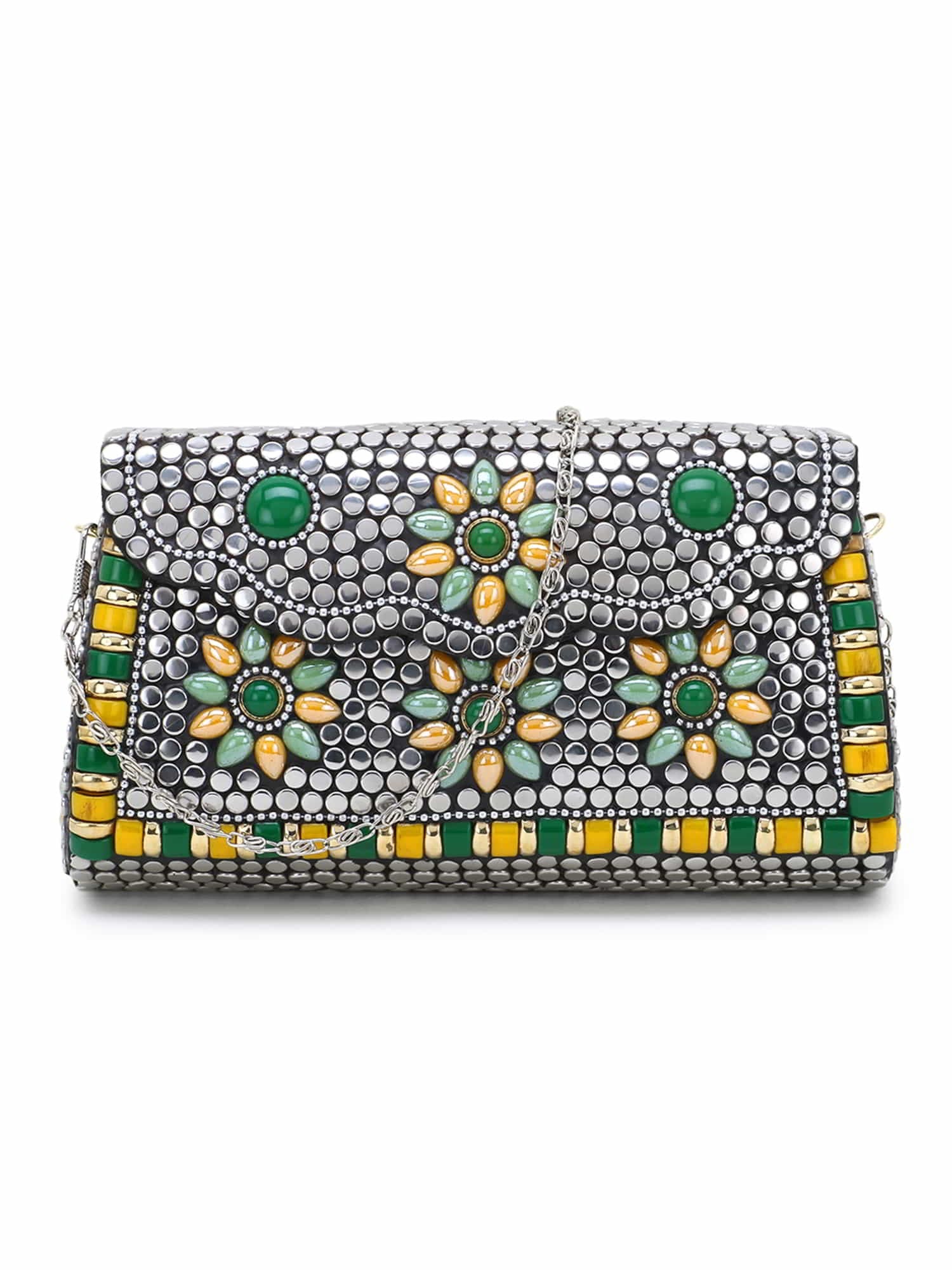 A must have Mosaic Clutch from Anekaant's Mosaic collection that will go great with your outfits. This Metal Clutch adds glamour to your evening look and makes you stand-out in the crowd. The sturdy Clutch and Detachable Metal Chain will make sure you are never worried of it breaking apart. Secured with a Click closure, you will find this Clutch quite spacious to hold a phone, makeup, keys and a small pouch.